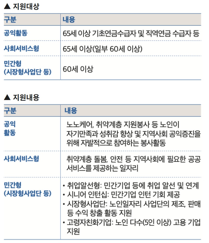 이는 취약계층 노인의 기본적인 소득 보전을 목적으로 하며, 월 30시간 근무에 약 29만 원 수준의 활동비가 지급됩니다.